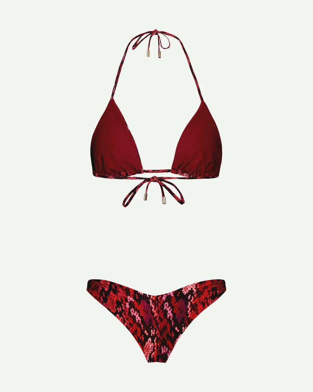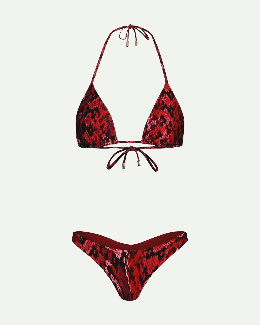 Questo sexy bikini realizzato in lycra doppiata è composto da un reggiseno triangolare ed un piccolo slip sgambato. Il modello è impreziosito da finalini metallici color oro. Tessuto lucido e brillante stampato.